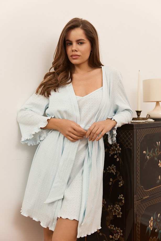Вишуканий домашній халат жіночий з бавовни колекції Sandra в блакитному кольорі. Довжина вище коліна, рукав 3/4. Рукава і низ халатика прикрашені рюшиками. Бавовняна тканина "дихаюча", легка та приємна на дотик, в мілку перфорацію.