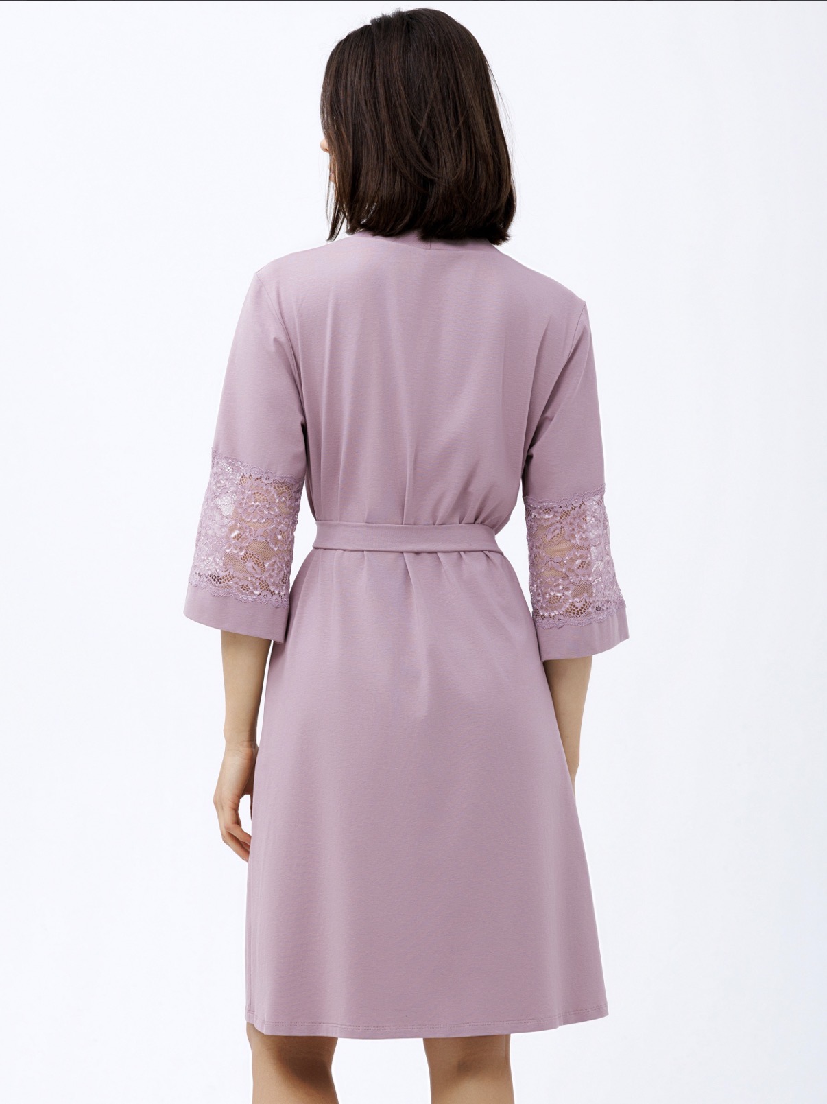 Вишуканий халат для жінок ніжно-рожевого кольору. Його елегантний крій на запах із поясом підкреслює жіночність, а широкі рукави з мереживною вставкою додають ноту романтики.