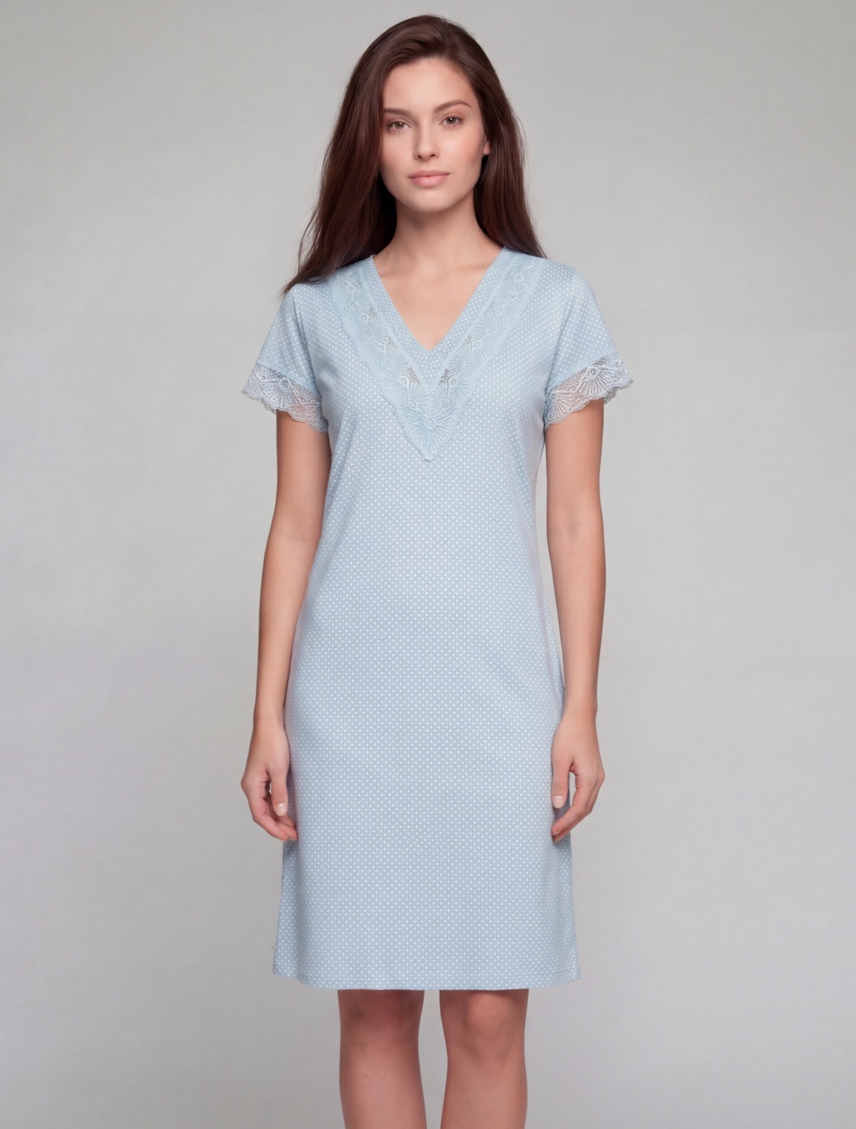 V-виріз і рукави оздоблені ніжним мереживом, а блакитний колір додає свіжості образу.