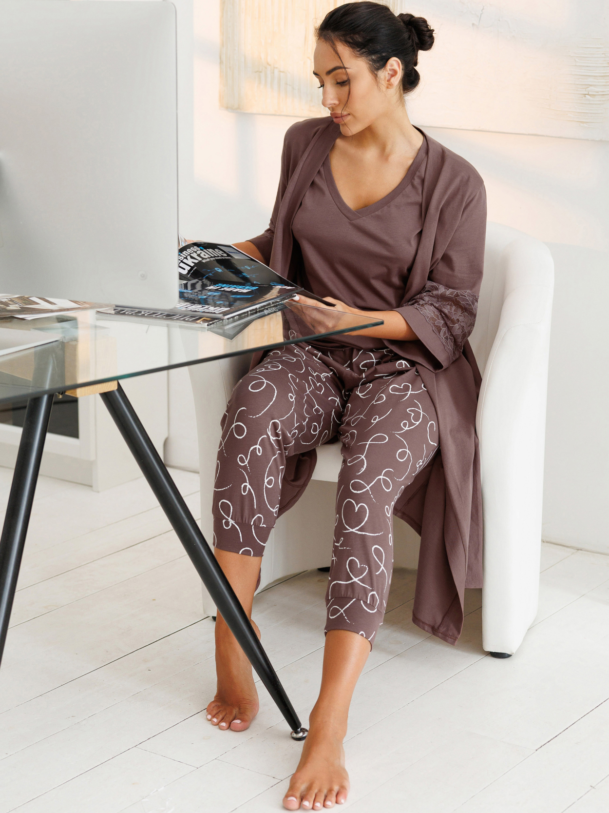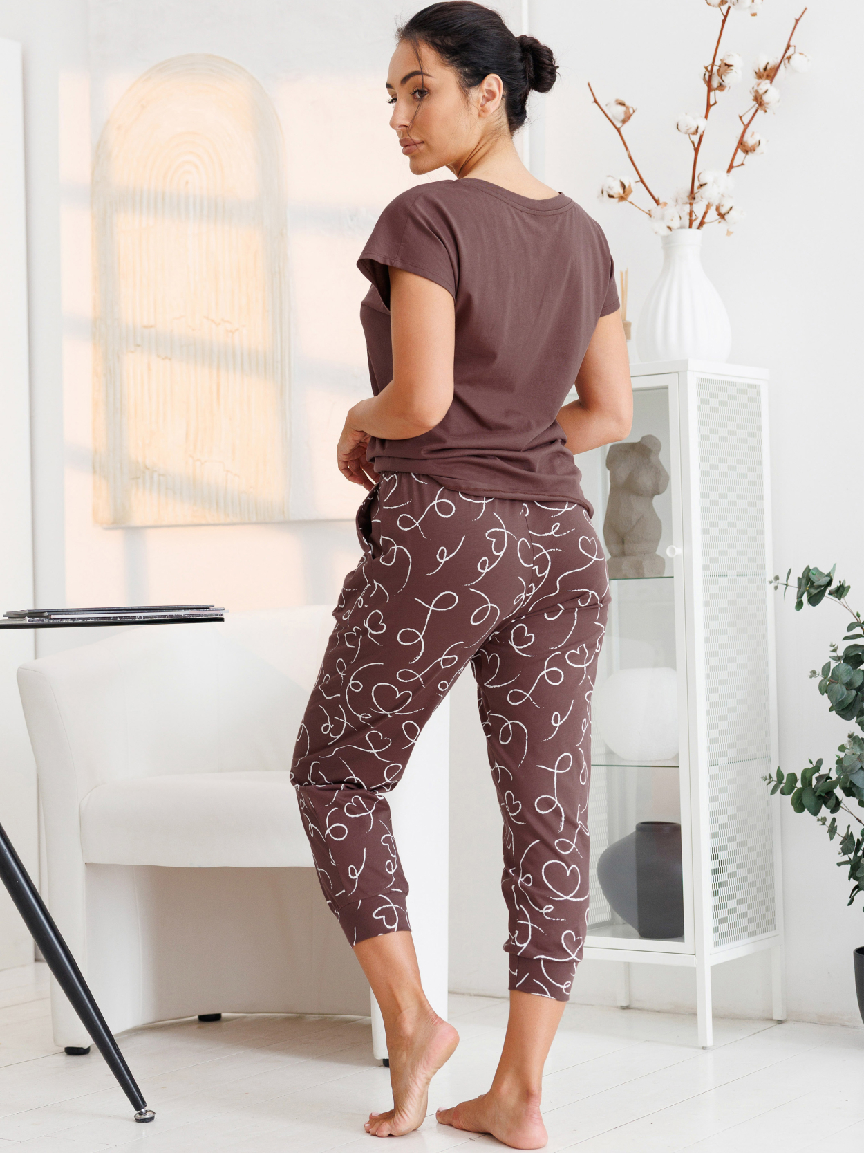 Ця піжама коричневого кольору з футболки та бриджів — ідеальне поєднання комфорту та елегантності. Кавовий відтінок заспокоює, абстрактний принт додає легкого ритму, а сучасний крій з V-подібним вирізом і коротким рукавом створює силует, у якому хочеться залишатися.
