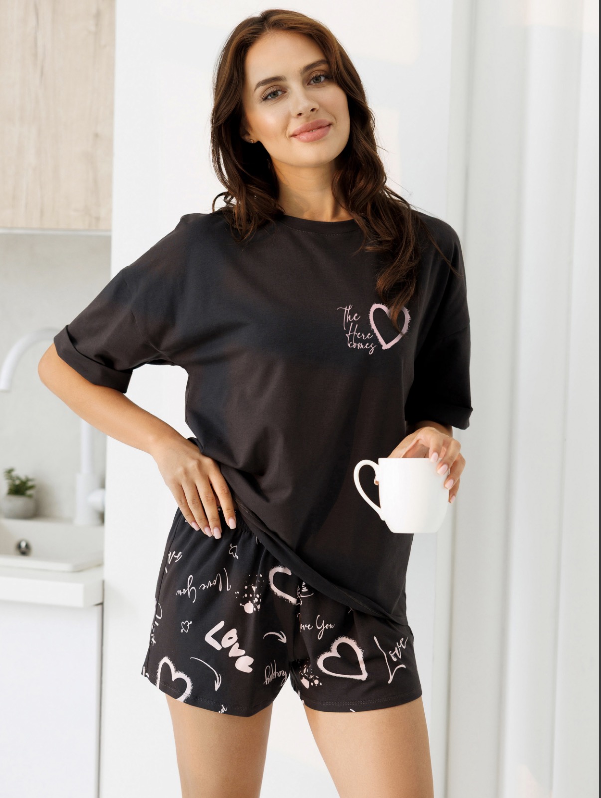 Натуральна бавовна тут про відчуття: дихає, м’яка, не дратує шкіру — ідеально як жіночий одяг для сну та відновлення. Це темно-сіра піжама, яку легко носити цілий день удома.